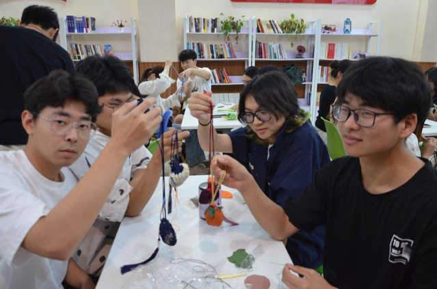 现场布置温馨雅致,同学们围坐一堂,在老师的指导下,互帮互助、欢声笑语不断,亲手制作出了一个个饱含心意的作品。在香包缝制区,同学们挑选心仪布料,穿针引线,将艾草粉装入香囊之中,寄托对健康与平安的美好祝愿;五彩绳编织区则充满创意与协作,一根根红黄蓝绿黑白的丝线交织成吉祥如意的象征;艾草锤制作区更是热闹非凡,大家亲手打造可以拍打经络、舒缓疲劳的养生锤,既实用又有趣;而纸船DIY区域,则让同学们回归童真,用一张张彩纸折叠出承载梦想的小船。