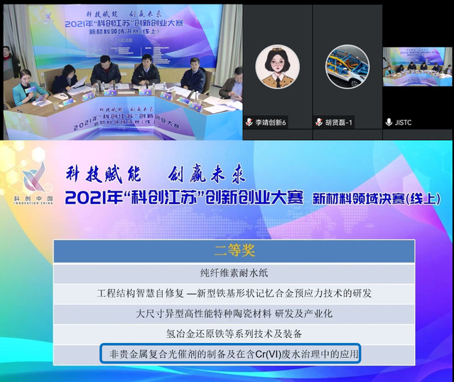 今年8月,我院李靖教授的《非贵金属复合光催剂的制备及在含Cr(VI)废水治理中的应用》经徐州市化学化工学会推荐,徐州市科学技术协会向江苏省科学技术协会申报,最终进入决赛。由于新冠疫情的影响,决赛的路演答辩改为线上进行。来自江苏省内的30名选手相聚“云端”,展开了激烈角逐。李靖教授不畏强敌,一路过关斩将,荣获创新组二等奖。该奖也是徐州市在此大赛中荣获的唯一一个奖项!