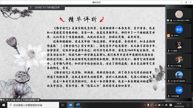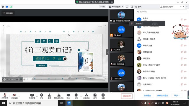 为了更好迎接即将到来的第27个世界读书日,丰富疫情期间同学们的课余生活,2022年4月18日至28日,我院承办了校“好书共读,余香悠远”读书分享会。并于28日傍晚举办读书分享会线上决赛。