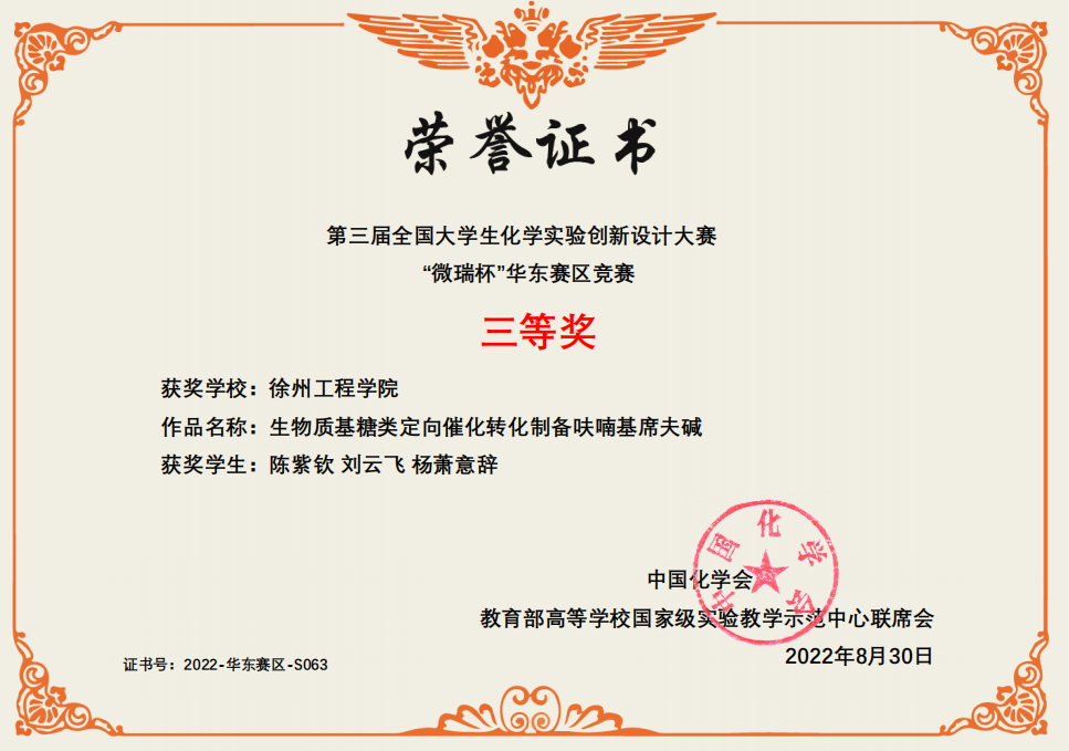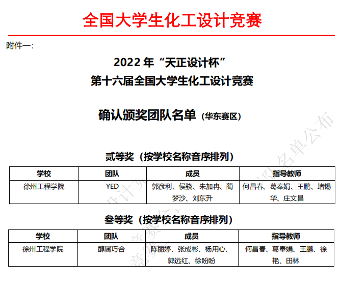 近期,我院在全国高校学科竞赛特别是I类赛事中连创佳绩,取得了一个又一个奖项。么冰老师指导学生在第十二届"挑战杯"江苏省大学生创业计划竞赛中荣获江苏省银奖、在第八届中国国际“互联网+”大学生创新创业大赛江苏省选拔赛中荣获江苏省二等奖;何昌春等7位老师指导学生参加第十六届全国大学生化工设计竞赛,共斩获国家二等奖1项、三等奖1项,华东区赛一等奖1项、三等奖3项,江苏省赛一等奖2项、二等奖7项;葛奉娟老师指导学生参加第五届全国大学生化工实验大赛华东区赛获得二等奖1项、仿真实验单项奖1项;杨华美、张天舒老师指导学生参加第三届全国大学生化学实验创新设计大赛华东区赛获三等奖2项。