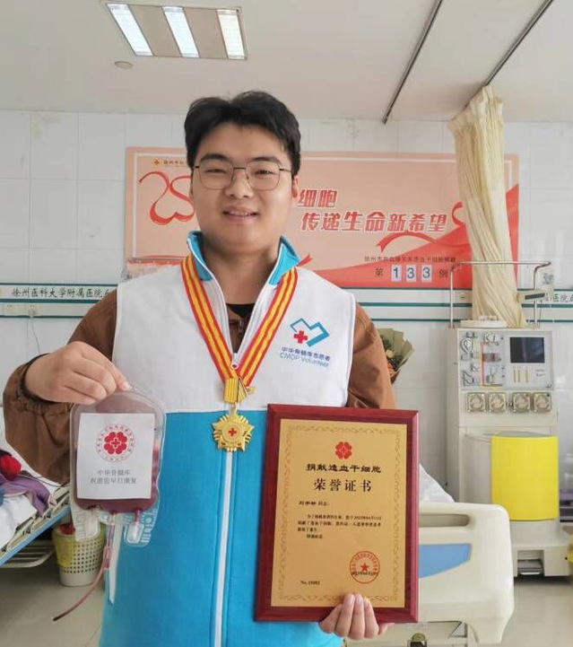 刘宇轩同学在校期间热心公益,组织参加过多次公益募捐、志愿服务及献血活动。2021年在一次献血时,经工作人员宣传介绍,他义无反顾地加入了中华骨髓库,成为一名造血干细胞志愿捐献者。2022年12月,当得知他与一名白血病患者骨髓配型成功,被问询是否同意捐献时,刘宇轩毫不犹豫地作出了肯定回答。得知刘宇轩的决定后,家人和学院对刘宇轩这一义举十分支持。在此期间,刘宇轩注意饮食、锻炼身体,确保高分辨分型全相合、体检合格,为捐献造血干细胞做好充分准备工作。