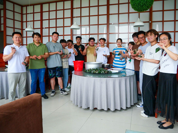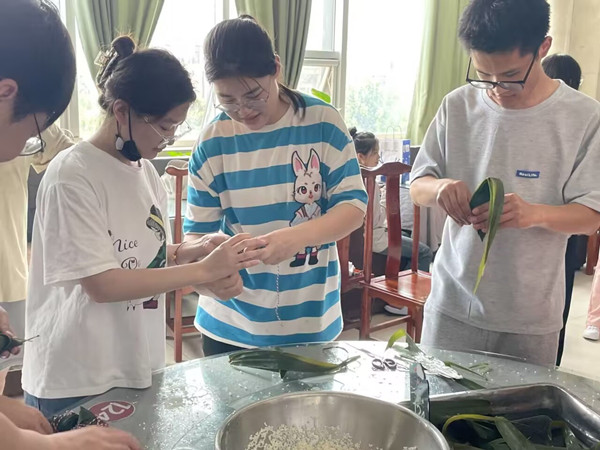 赛前,同学们将粽叶、红豆、蜜枣、花生、糯米等材料摆上桌,食堂工作人员手把手教同学们包粽子。比赛现场,同学们填米、裹粽、绑线一气呵成,活动气氛热烈、温馨、祥和,各族同学亲切交谈,一起交流分享各族欢度端午的形式,在欢声笑语中联络感情,共话端午。