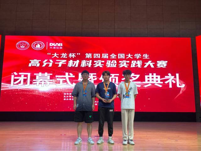 7月20日至25日,“大龙杯”第四届全国大学生高分子材料实验实践大赛(双实大赛)总决赛在金城兰州举行。大赛由教育部高等学校材料类专业教学指导委员会指导,由全国大学生高分子材料实验实践大赛竞赛委员会主办。我校材化学院刘俊杰、丁扬、金杰尚三名同学组成的代表队在董黎明、宫贵贞老师的悉心指导下,经过激烈角逐,分别斩获金、银、铜奖,代表队首次获得团体三等奖。