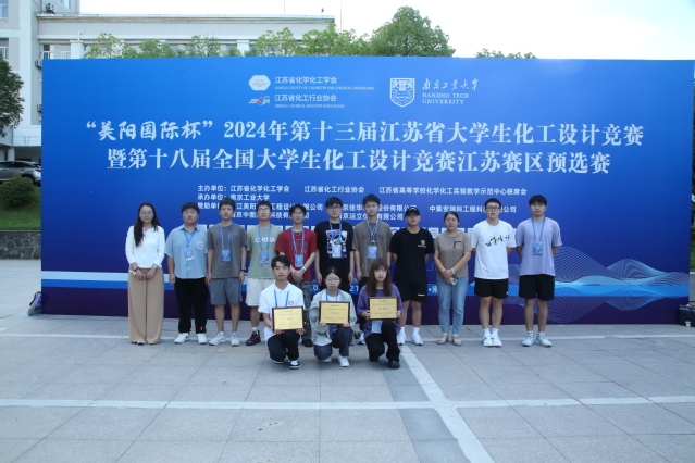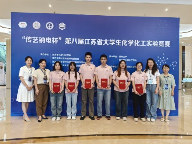 在第八届江苏省大学生化学化工实验竞赛中,李淼、周覃、蒋银兴、杨开泰、熊怿祺、陈佳敏等同学在葛奉娟、李靖、朱捷、冯惠、何昌春、张天舒等多位老师的悉心指导下,获得特等奖1项、一等奖1项、二等奖2项、三等奖2项。