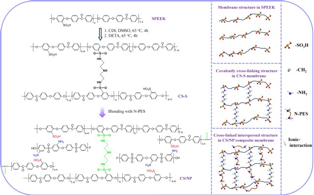 质子交换膜(PEM)作为新能源领域的关键材料,广泛应用于电解水制氢、燃料电池以及全钒液流电池(VRFB)等领域。本工作将含有氨基的聚醚砜聚合物(N-PES)引入到含有共价交联侧链的两性聚醚醚酮(CS-S)基体中制备了一种高性能复合质子交换膜(CS/NP)N-PES聚合物链段通过离子交联穿插嵌入CS-S共价交联网络框架中,在复合膜中形成交联穿插网络。这种结构与官能团之间的多重相互作用协调并诱导了长程质子传输通道,使得复合膜在具有超高尺寸稳定性和循环稳定性的同时具有优异的质子传导装配CS/NP-10VRFB单电池200 mA cm-2下超高的EE—78.3%,远高于Nafion 212 (64.0%)SPEEK (65.4%)CS-S(67.9%)。此外,CS/NP-10膜在150 mA cm-2下循环500次后,其EE仍保持在82.5%以上,这证实了其出色的循环耐久性和结构稳定性。这种基于共价交联基质和离子交联穿插增强的协同调节方法显著提高了质子电导率和电池性能,为设计高性能、低成本的VRFB质子交换膜材料提供了重要参考。